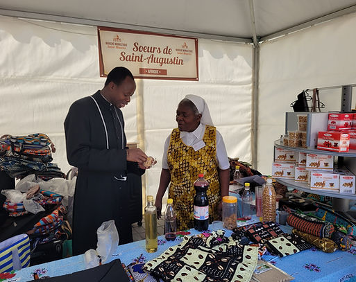 Produits : livres des éditions Saint-Augustin, rencontre et dédicace de la part des auteurs ; biscuits fourrés, flûtes au fromage, produits des autres monastères non présents.